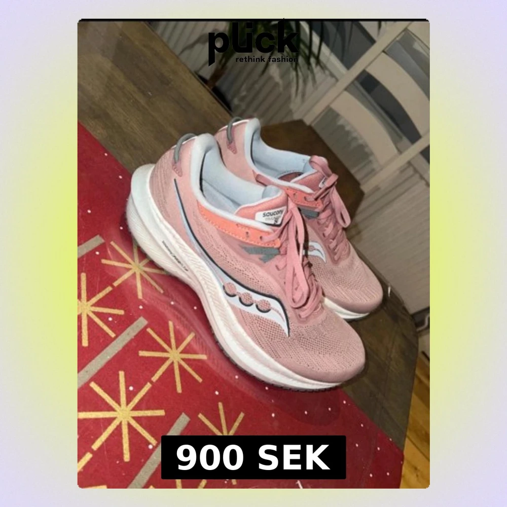Säljer ett par Saucony sneakers i ljusrosa med vit och grå sula. Skorna har mesh-ovandel för bra andningsförmåga, snörning och Sauconys logga i vitt och grått på sidan. Perfekta för träning eller promenader, riktigt sköna och snygga.
