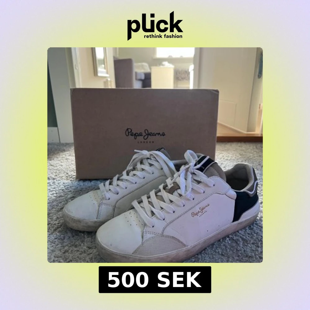 Snygga vita sneakers från Pepe Jeans med svarta och beige detaljer. Klassisk låg modell med rund tå, snörning och diskret logga i guld på sidan. Ovandel i skinn och textil, perfekt för en clean och stilren look.
