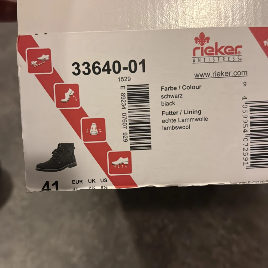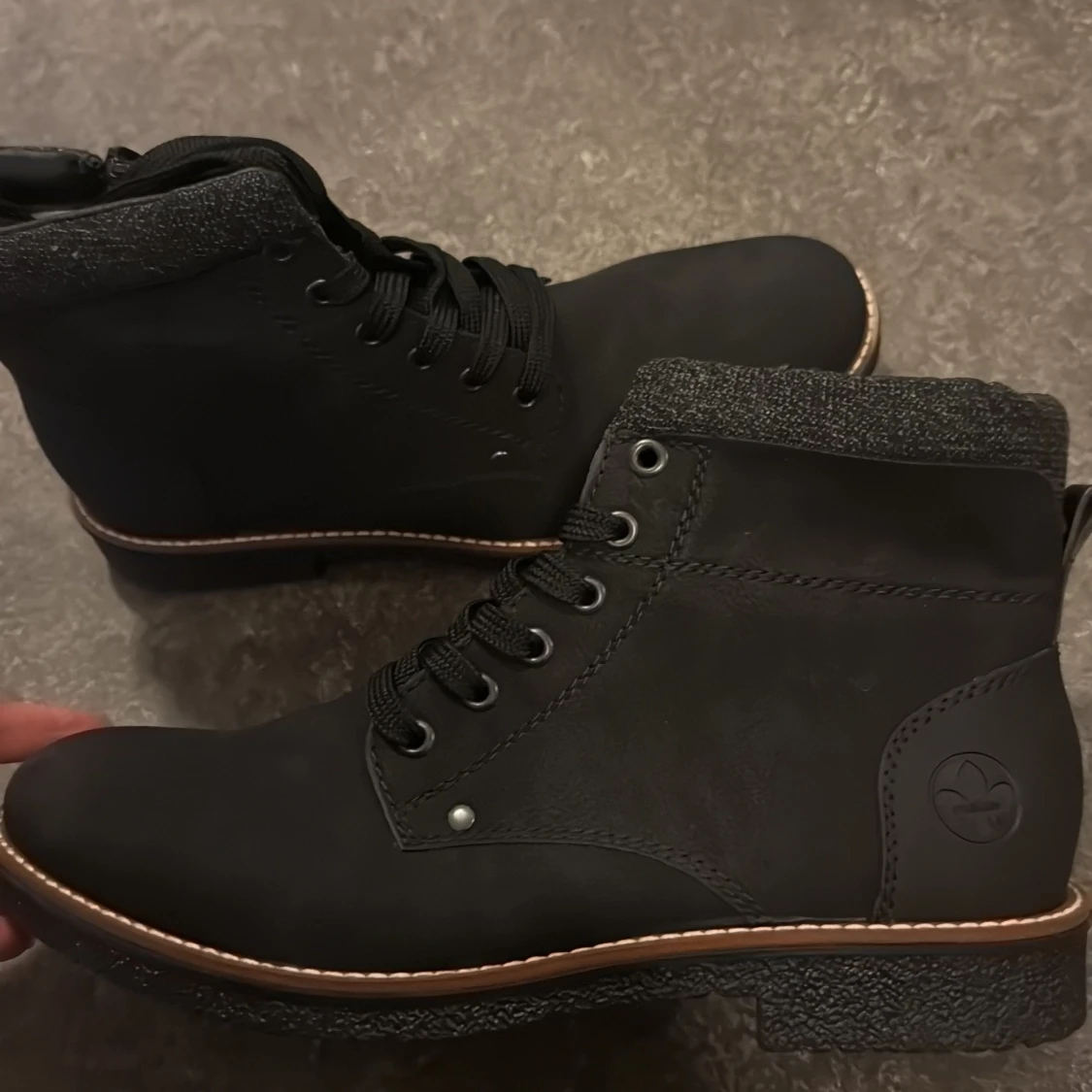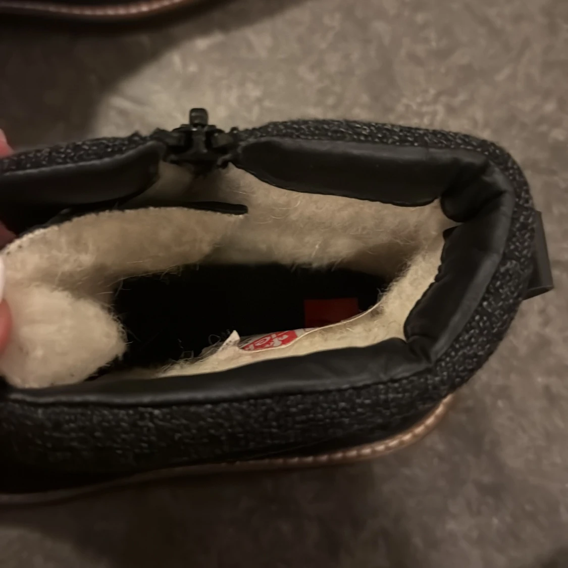 Svarta boots från Rieker med snörning, dragkedja på sidan och mjukt ullfoder. Ovandel i syntet med detaljer i textil och grov sula för extra grepp. Perfekta för kalla dagar med sin varma insida och stilrena look.