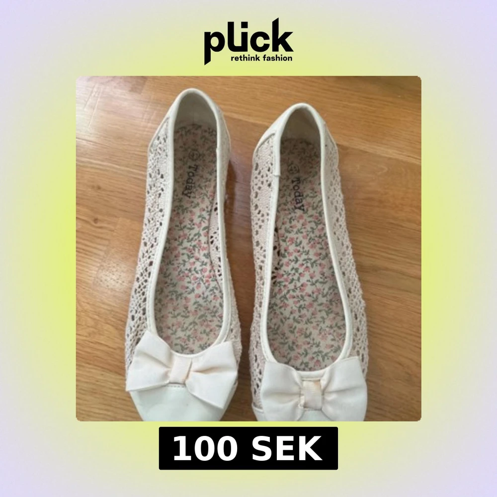 Söta vita ballerinaskor från Today med spetsdetaljer och stor rosett framtill. Skorna har rund tå och insida med blommigt mönster. Perfekta för vår och sommar när du vill ha en romantisk och feminin look.
