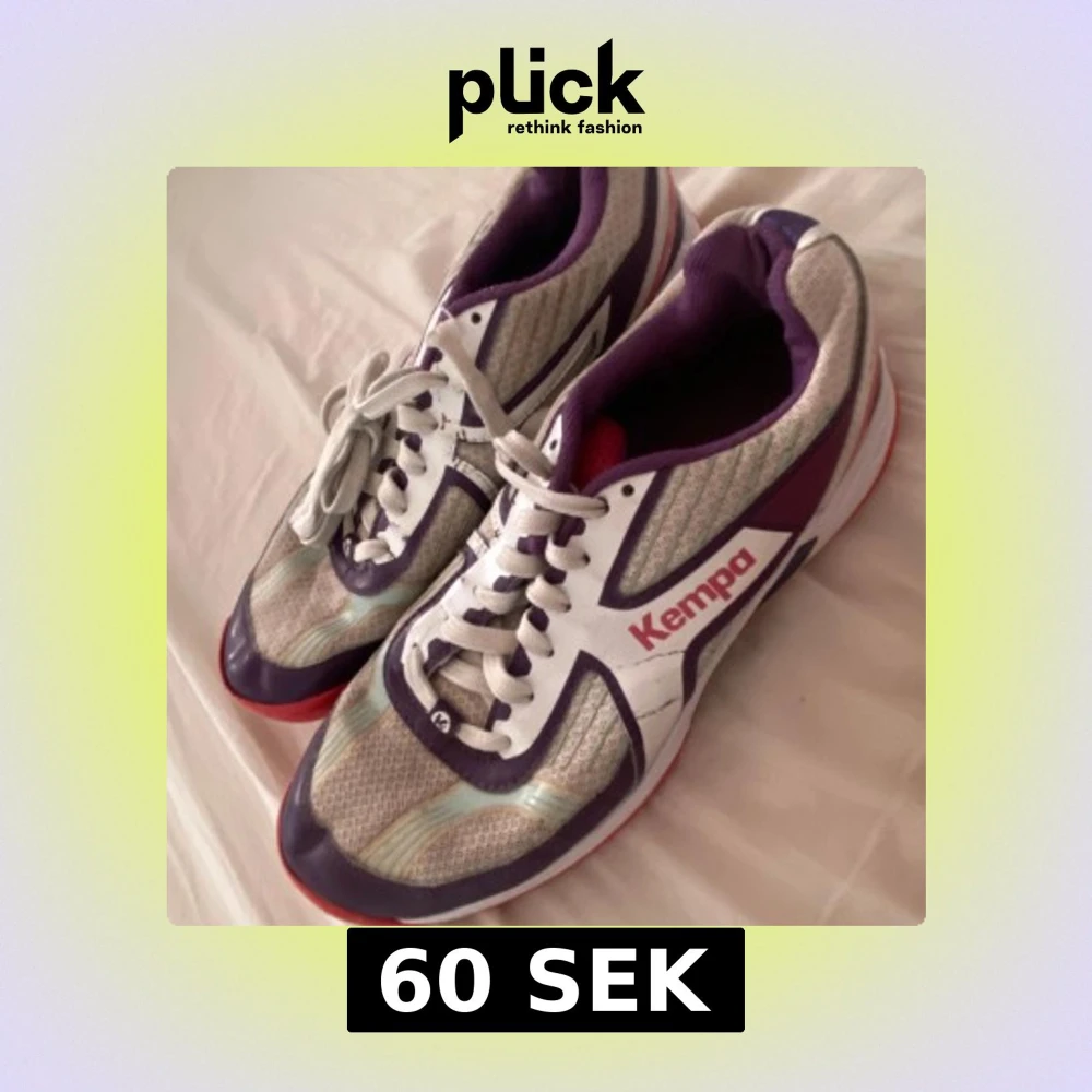 Säljer ett par sportiga Kempa sneakers i storlek 41. Skorna är vita med lila och röda detaljer, har snörning och en röd sula med bra grepp. Ovandelen är i syntetmaterial och mesh för bra andningsförmåga. Perfekta för inomhussport eller träning.