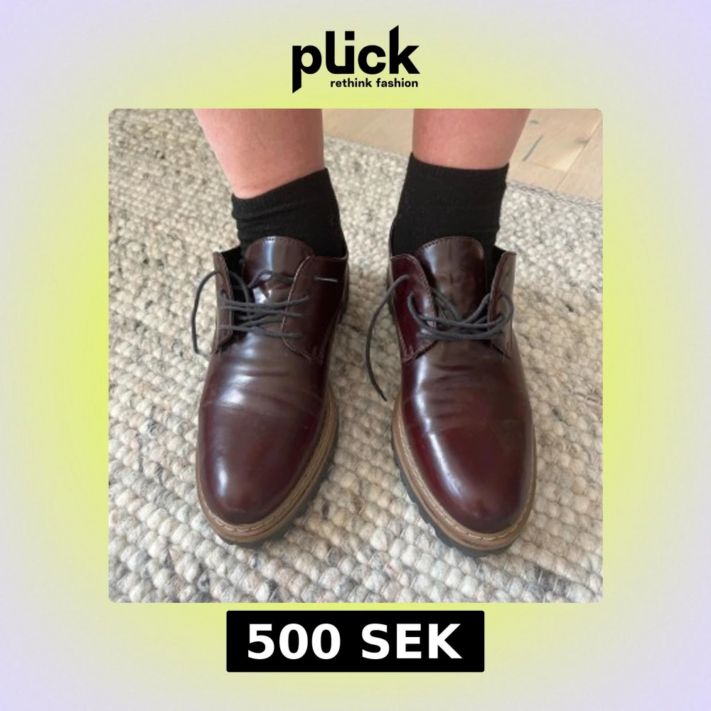 Snygga vinröda loafers köpta i Italien med chunky sula och snörning. Skorna har en rund tå och är tillverkade i glansigt skinn med kontrasterande brun sula och svart yttersula.