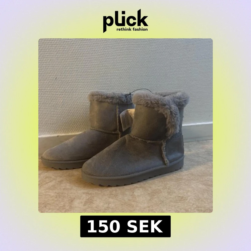 Mysiga grå boots med mjukt foder och mockaliknande utsida. Skorna har rund tå, platt sula och fluffig kant upptill. Perfekta för kalla dagar när du vill hålla fötterna varma och bekväma.