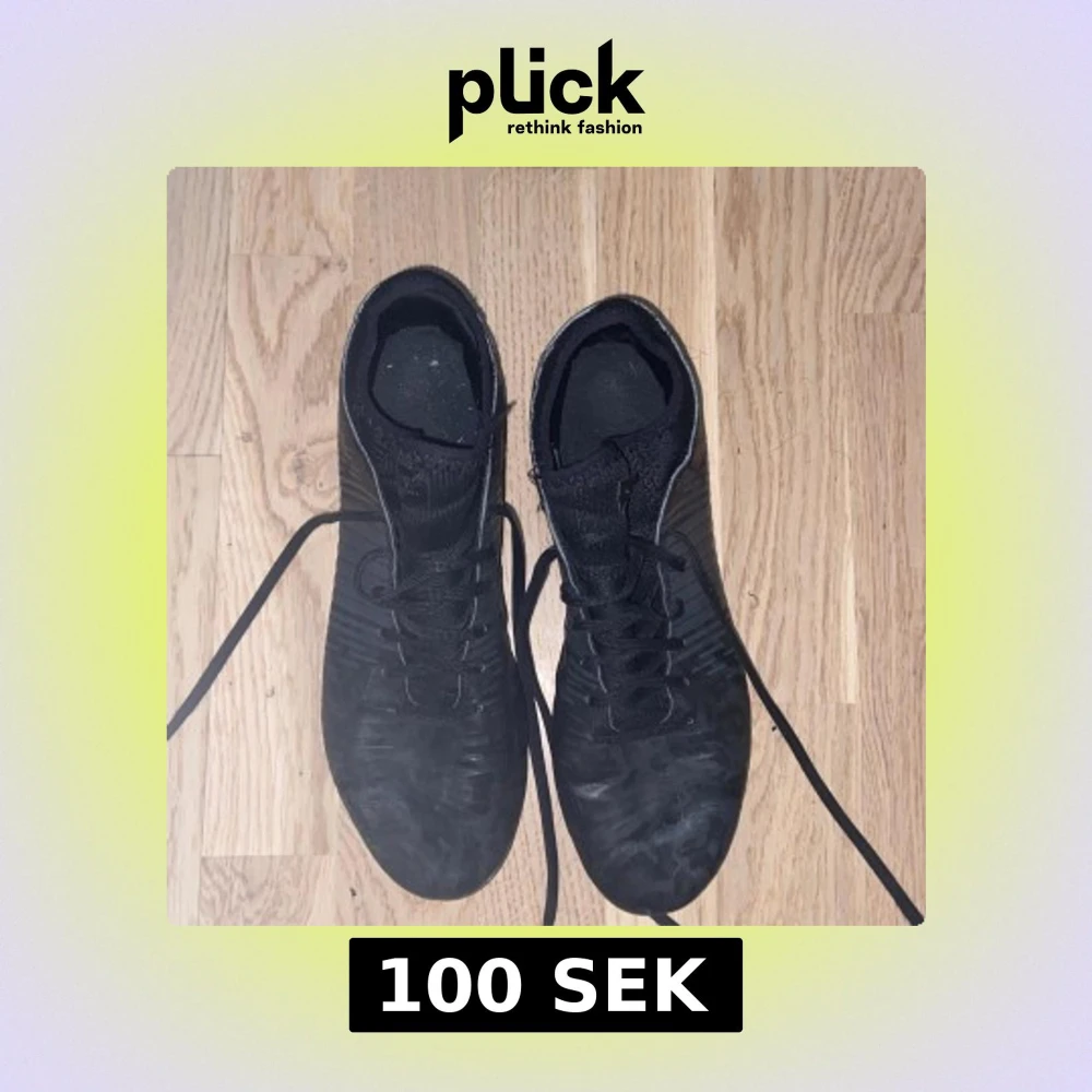Säljer ett par svarta fotbollsskor med snörning och rund tå. Skorna har en mönstrad yta och dobbar för bra grepp på planen. Perfekta för fotbollsträning eller match.