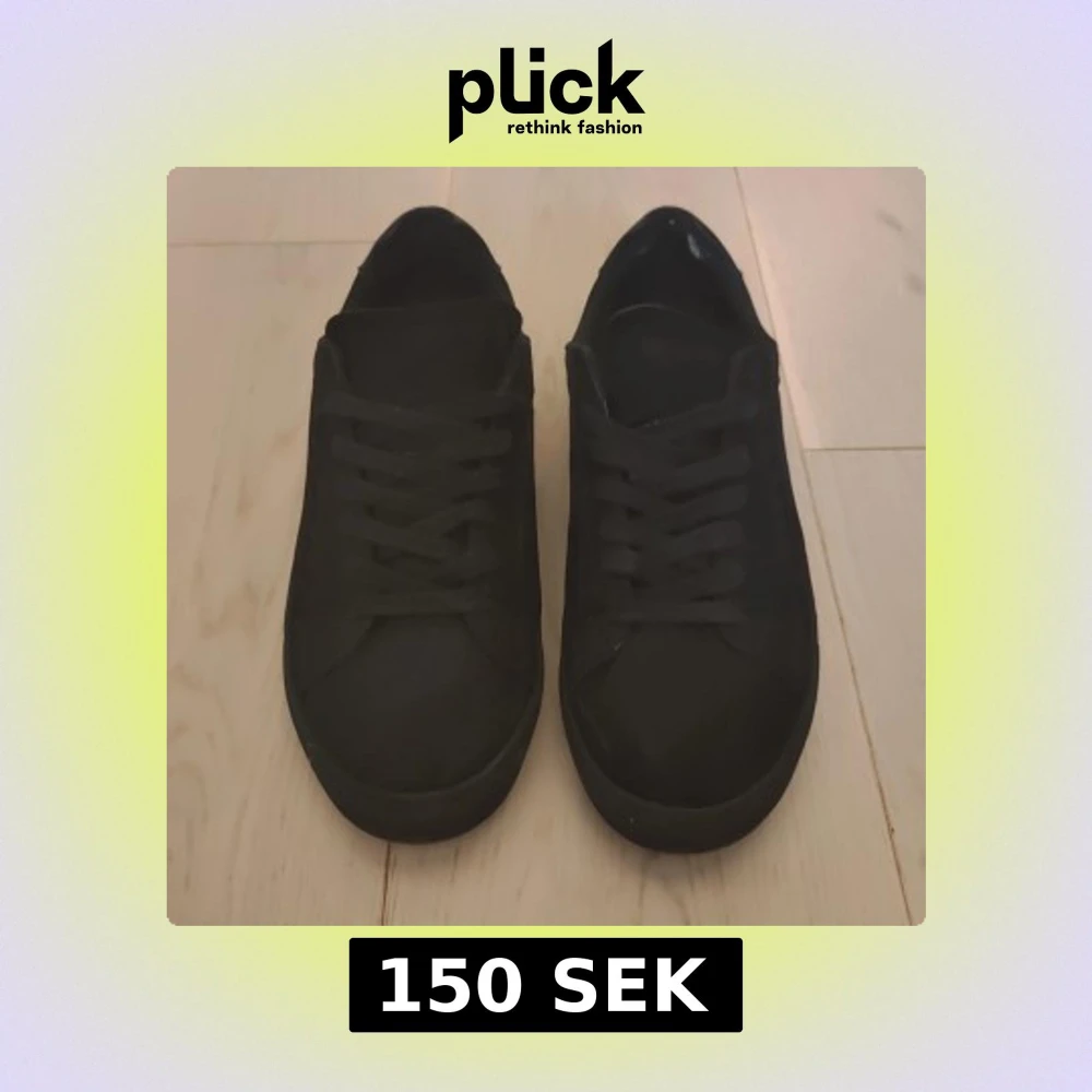 Säljer ett par helsvarta sneakers med klassisk design och rund tå. Skorna har platt sula och är tillverkade i syntetmaterial. Perfekta för en stilren och enkel look.