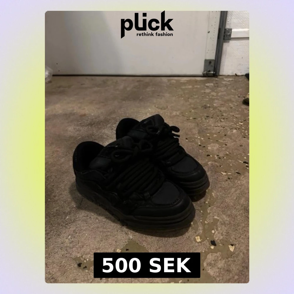 Säljer ett par svarta chunky sneakers med breda svarta skosnören och rund tå. Skorna har en tjock platt sula och är tillverkade i en mix av syntet och skinnmaterial. Perfekta för dig som gillar streetstyle och vill ha en cool look.