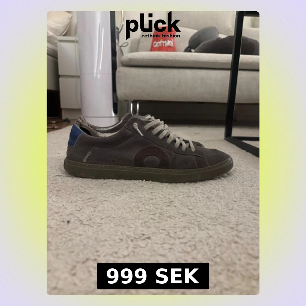 Säljer ett par grå sneakers i mocka Oliver cabell med rund tå och platt sula. Skorna har ljusgrå snörning och en blå detalj på hälen. Snyggt cirkelmönster på sidan och diskret söm vid kanten. Perfekt för dig som gillar stilrena och klassiska sneakers.