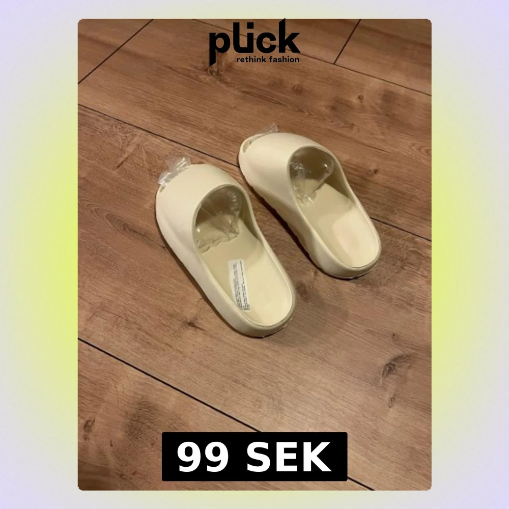 Säljer ett par stilrena beige tofflor med vågig sula och öppen tå. Skorna är gjorda i syntetmaterial och har en chunky, modern look som passar perfekt till sommaren. Superbekväma att glida i och lätta att matcha med olika outfits. Storlek 42/43