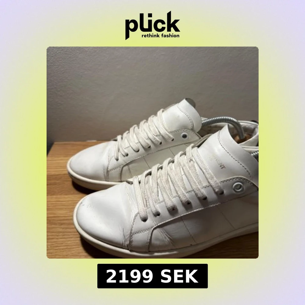 Snygga vita sneakers från Saint Laurent med unika läppdetaljer i blått och rött på hälen. Skorna har klassisk snörning och är tillverkade i skinn. Skicket är ungefär 7/10 och har fortf mycket at ge! Kom med prisförslag och strl är 42!