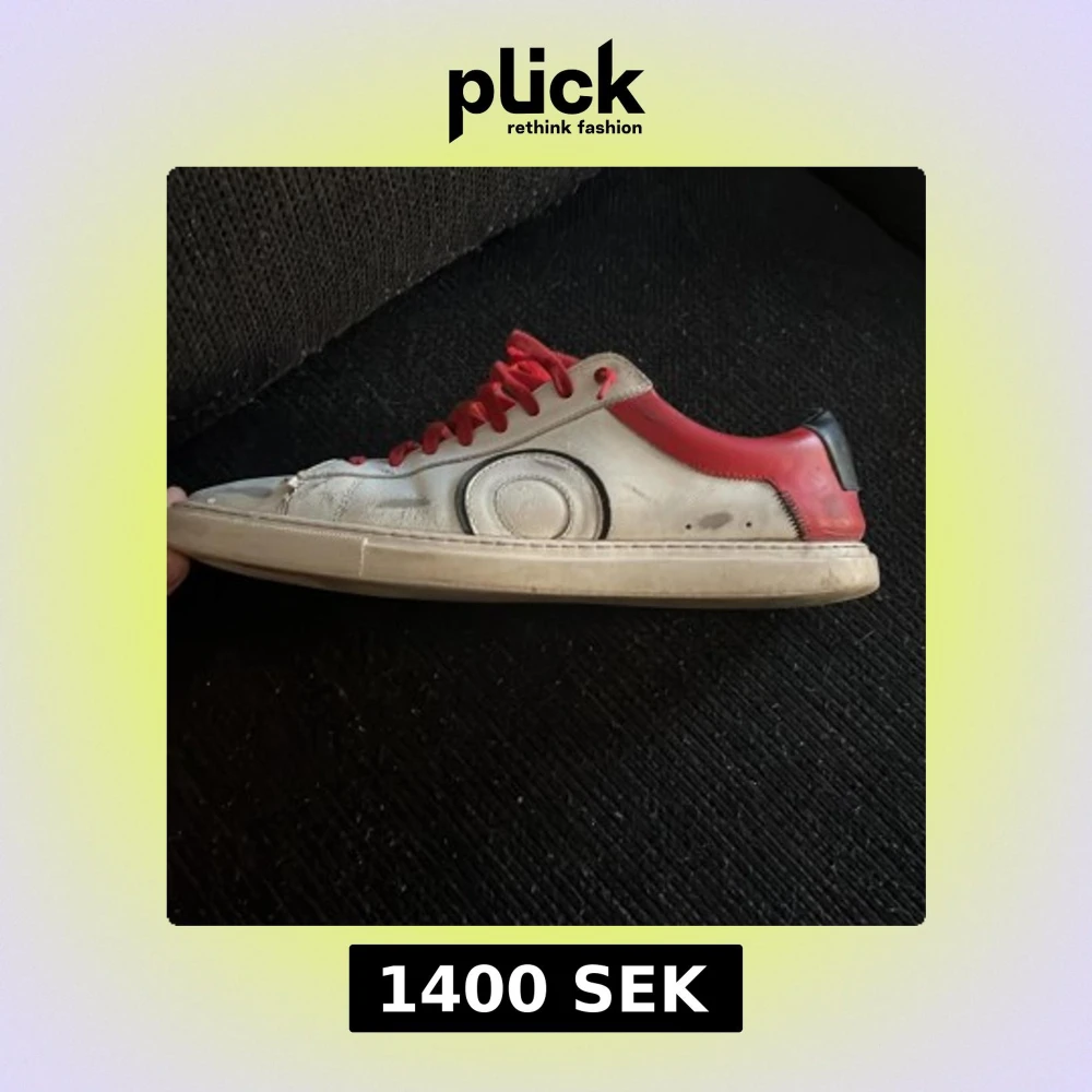 Snygga sneakers i svart och rött med vita detaljer. Skorna har en klassisk rund tå och är utrustade med röda snören. Perfekta för en stilren look. Endast små skador med är enkel fixade med hjälp av t.ex skolim Nypris 2600 (inkl tull) Priset ej hugget i sten så buda på🙂