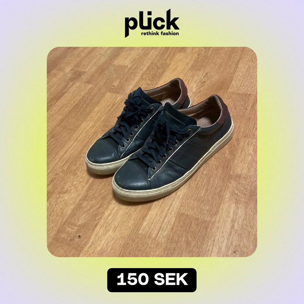 Säljer ett par Mörkblå sneakers i skinn med bruna detaljer vid hälen. De har en klassisk design med snörning och en vit sula som ger en snygg kontrast. Perfekta för vardagsbruk och i bra skick. Passar till det mesta i garderoben!