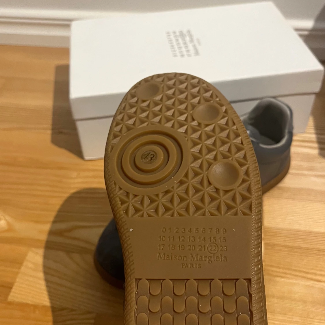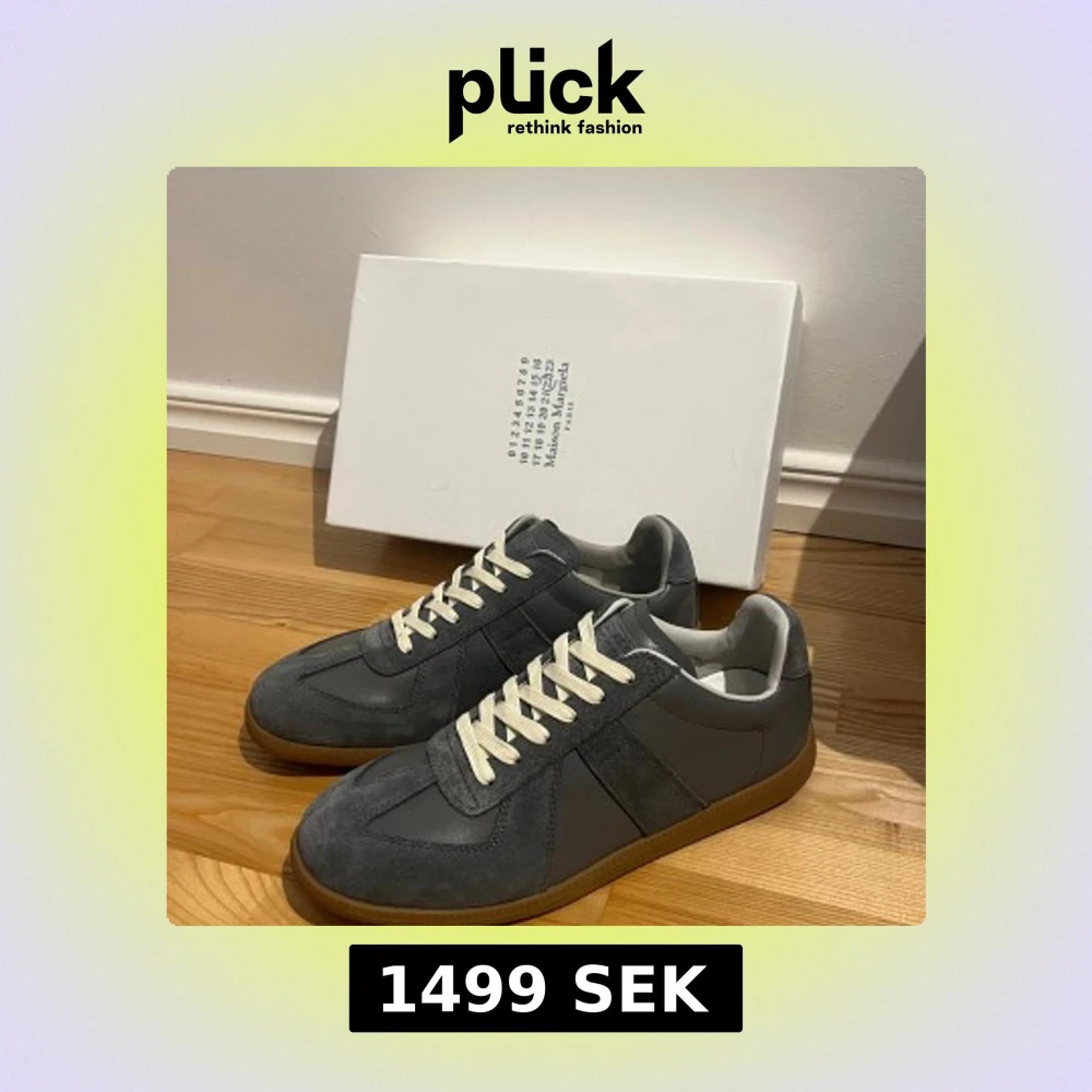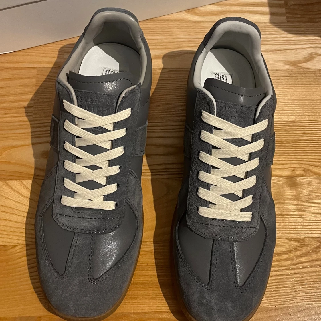 Maison Margiela sneakers i grå med kontrasterande vita snören och gummisula. En rund tå och platt sula. Klassisk sportig siluett med diskret logotyp på tungan och vit insida. Perfekt för dig som gillar stilrena och lyxiga sneakers. Box ingår.
