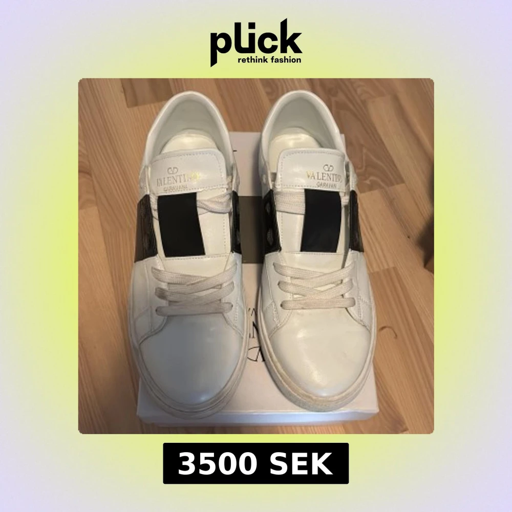 Säljer ett par vita Valentino Garavani sneakers med svart detalj på sidan och vita snören. Skorna har en klassisk rund tå och platt sula, samt nitar längs hälen för en extra touch. Perfekta för dig som gillar stilrena och exklusiva sneakers. De är storlek 43 men funkar för de som har storlek 42.