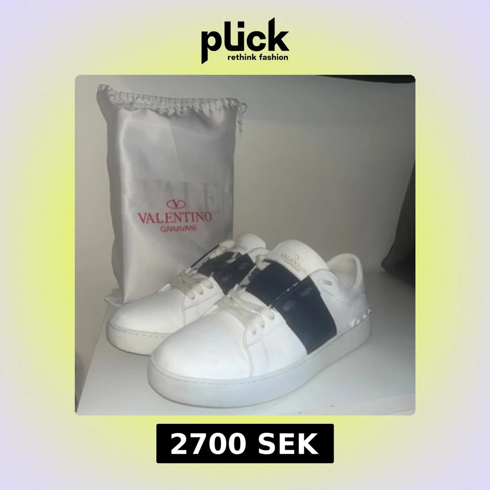 Säljer ett par vita Valentino Garavani Open sneakers med mörkblått band över vristen och ikoniska nitar baktill. Skorna har snörning och är tillverkade i skinn. Kommer med originalpåse och pricetags.