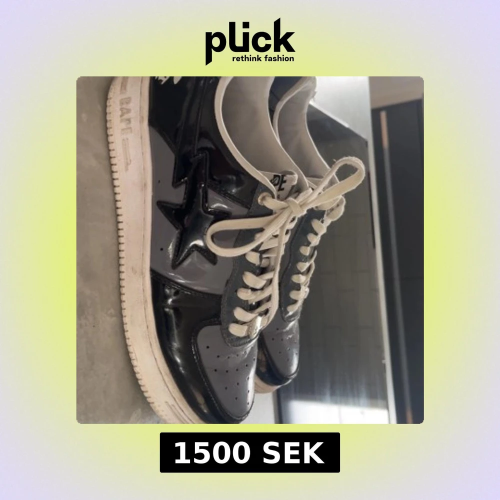 Säljer ett par klassiska BAPE STA sneakers i svart och grå lackad syntet med vit sula. Skorna har snörning och den ikoniska stjärnloggan på sidan. Perfekta för dig som gillar streetwear och vill sticka ut med en unik stil.