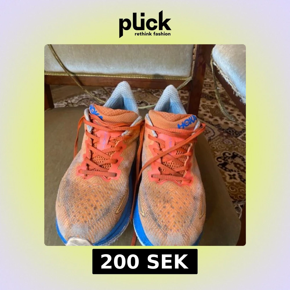 Säljer ett par Hoka Clifton 9 sneakers i orange med blå detaljer och vita inslag. Skorna har mesh-ovandel för bra ventilation, platt sula och snörning. Perfekta för löpning eller träning, med sportig look och bekväm passform. Snyggt Hoka-tryck på hälen och sidan.