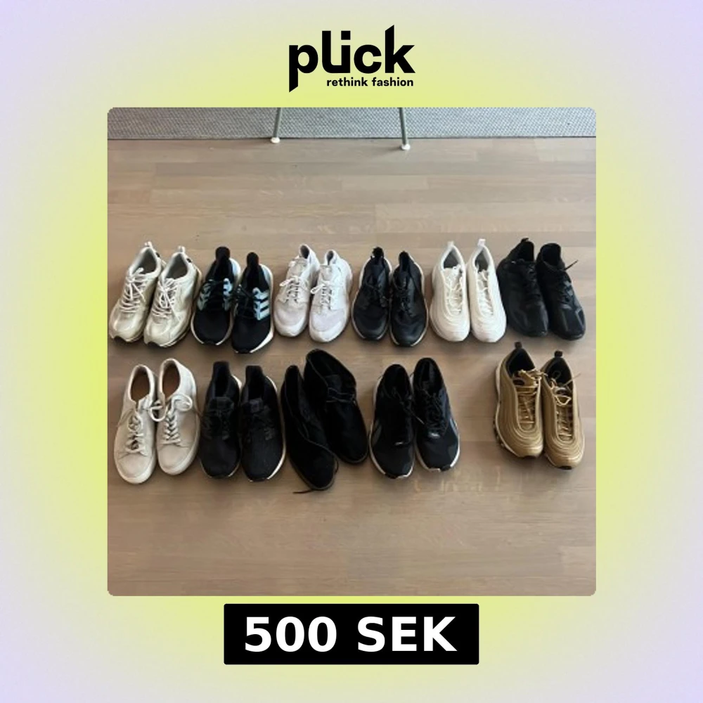 En samling sneakers i olika färger och stilar, inklusive vita, svarta och guldiga modeller. Märken som Adidas och Nike finns representerade. Skorna har detaljer som snörning och varierar i material från syntet till skinn. Skicka ett meddelande vilka skor som är intressanta så pratar vi om priset!