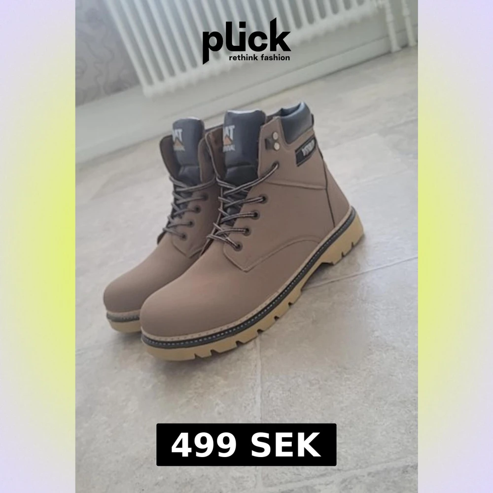 Snygga beige boots med svart vadderad kant och grov sula. Skorna har snörning med svarta och vita skosnören samt rund tå. Perfekta för dig som gillar en robust och stilren look till höst och vinter. Dem är helt nya.