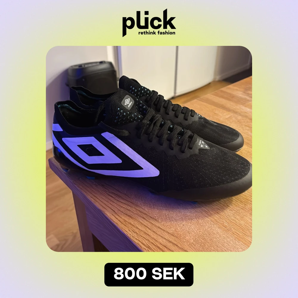 Säljer ett par svarta fotbollsskor från Umbro i nytt skick. Skorna har en snygg design med vita detaljer och snörning. De är perfekta för fotbollsträning och matcher. Sulan har flera dobbar för bra grepp på planen. Passar dig som vill ha stil och funktion i ett. Skorna är helt splitter nya