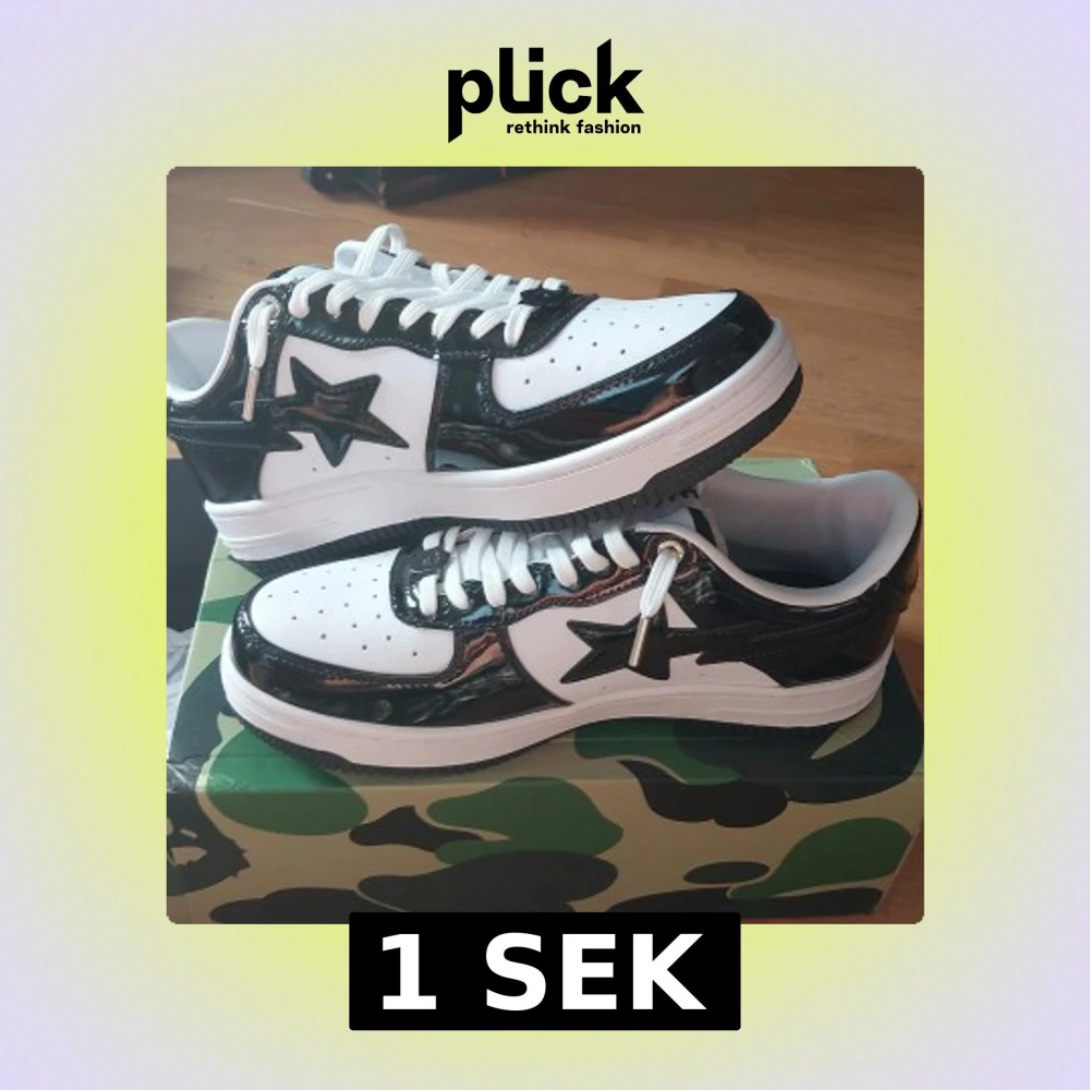 Snygga Bape Sta sneakers i svart och vitt med glansiga svarta detaljer och den ikoniska stjärnan på sidan. Skorna har vit ovandel, svarta lackpaneler och vit sula med svart yttersula. Perfekta för dig som vill sticka ut med streetwear-stil.