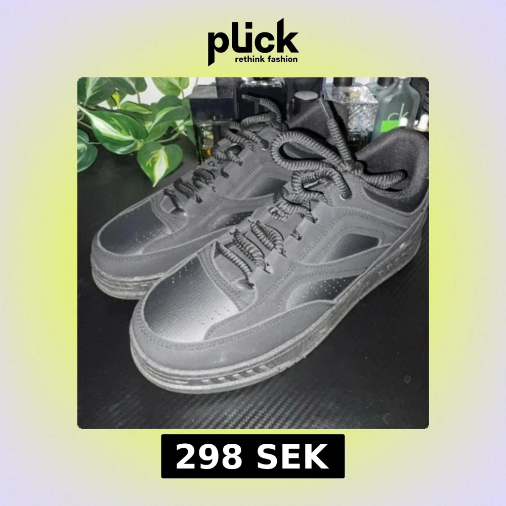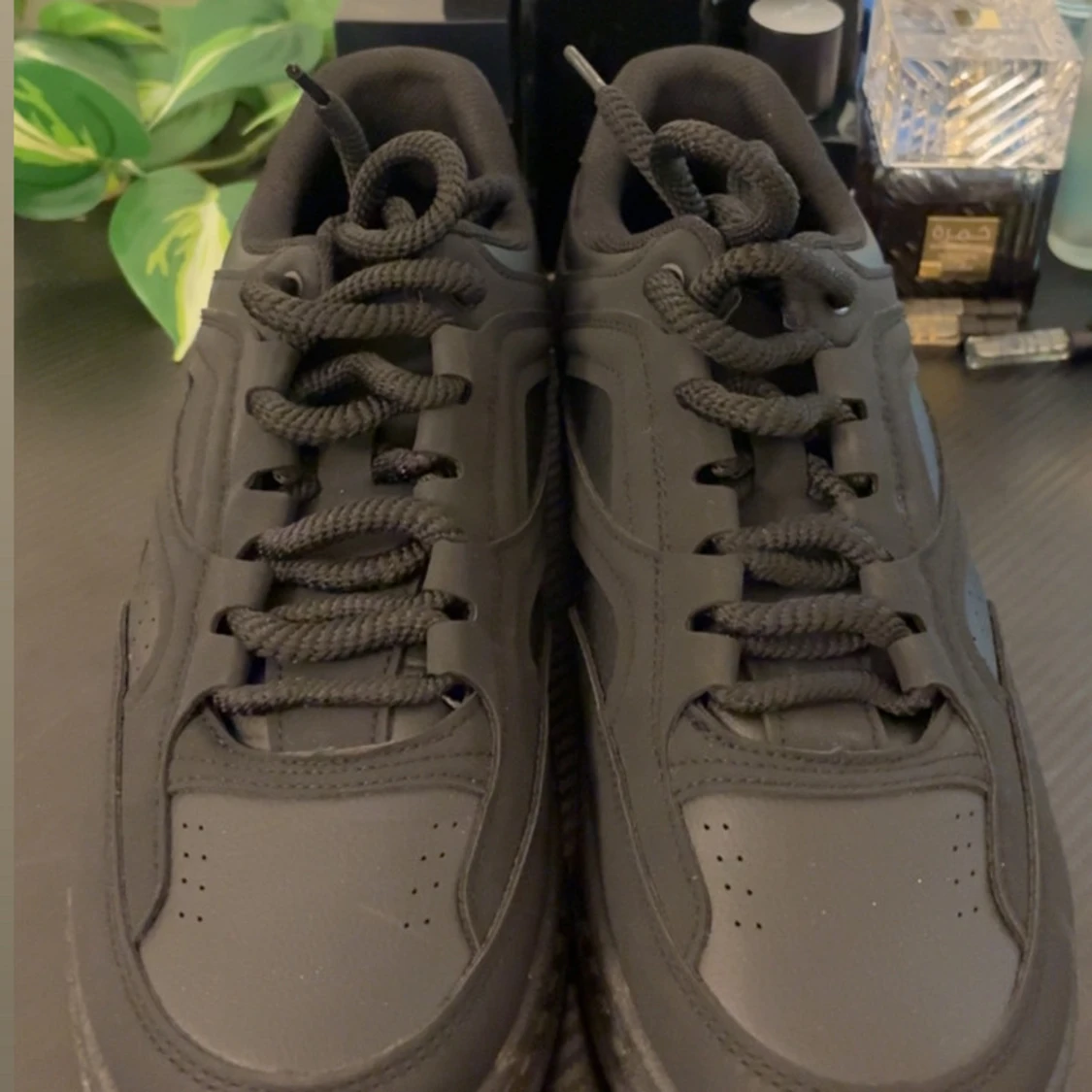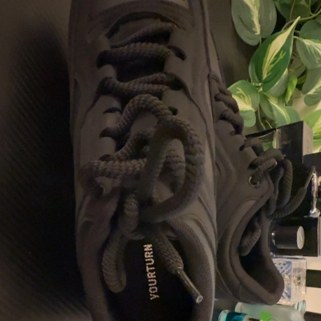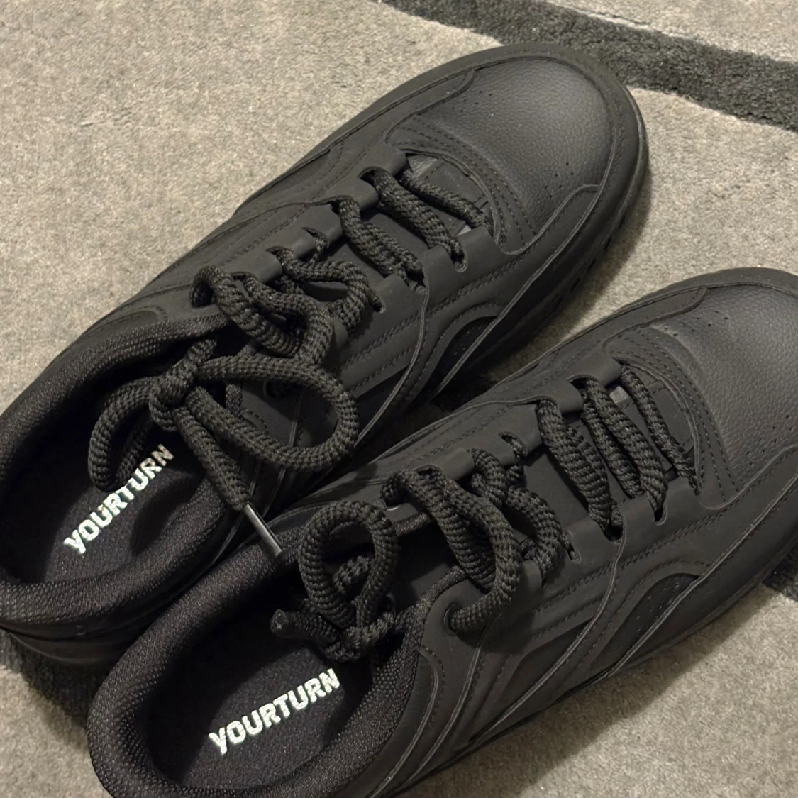 Säljer ett par helsvarta sneakers från YOURTURN med chunky sula och rund tå. Skorna har snörning och är tillverkade i syntetmaterial med diskreta sömdetaljer och perforeringar på tån. Perfekta för en clean och stilren look.