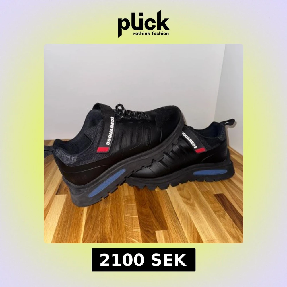 Chunky svarta sneakers från Dsquared2 med grov sula och snörning. Skorna har detaljer i rött och blått samt Dsquared2-logga på sidan. Ovandelen är i en mix av textil och syntetmaterial för en sportig look.
