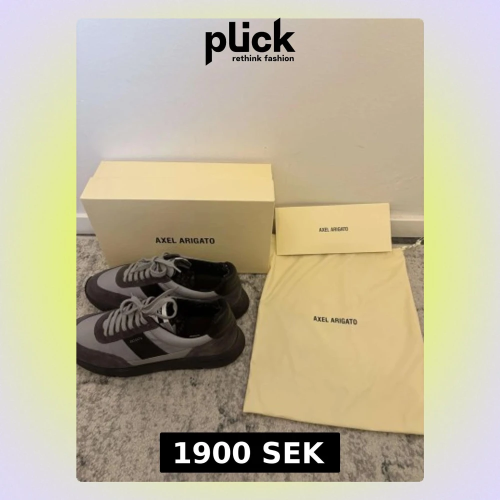Snygga sneakers från Axel Arigato i grått och svart läder och mocka. Skorna har snörning och detaljer. Medföljer originalkartong och dustbag. Skorna är bara använda ett par gånger. Perfekt för dig som gillar stilrena och moderna sneakers.