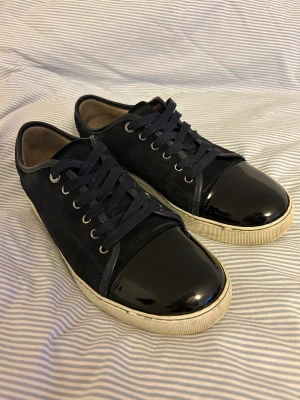 Lanvin - Snygga blå sneakers med svarta, blanka tåkappor och snörning. Skorna har en vit sula som ger en fräsch kontrast. Perfekta för en stilren look. Skick 9/10. Ända defekten är insida häl men syns ej när de sitter på. Kom med fler bilder eller minsta lilla fråga. Storlek Uk 8 vilket motsvara ungefär 43.