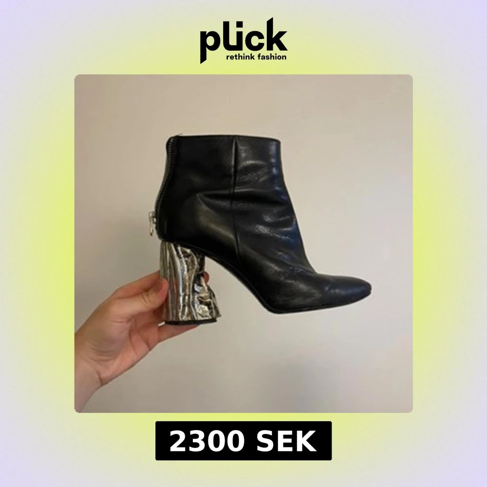 Unika svarta boots från Acne Studios i skinn med cool silvrig klack. Dragkedja baktill. Inget synligt slitage. De är slitna på undersidan men kan lätt lämnas in till en skomakare om man vill åtgärda! I övrigt är det jättefin kvalitet och lädret ser är väl bevarat, så inget synligt slitage. Original lådan medföljer!