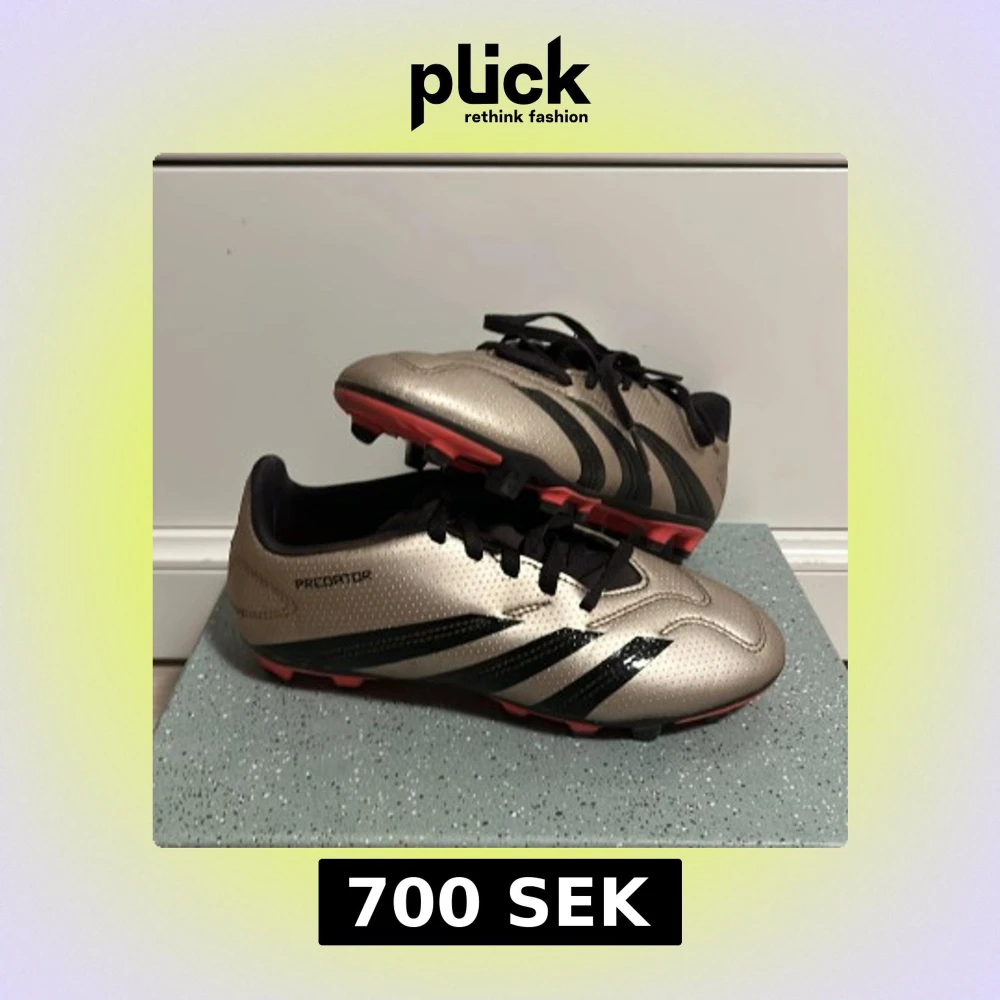 Snygga Adidas Predator fotbollsskor i metallic guld med svarta detaljer och röda dobbar. Skorna har klassisk snörning och de ikoniska tre svarta ränderna på sidan. använt i typ tre dagar, säljer för att de inte passade. Köptes för 1500 säljs för 700 skriv om pris och mer ni undrar över.