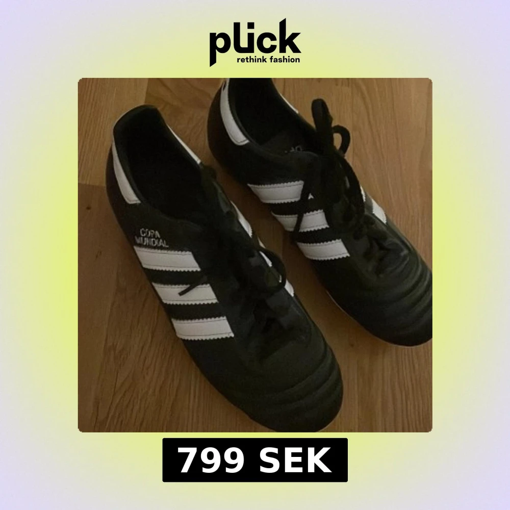 Säljer ett par klassiska Adidas Copa Mundial fotbollsskor i svart och vitt. Skorna har tre vita ränder på sidorna, snörning och rund tå. Ovandelen är i mjukt skinn och sulan har dobbar för gräsplan. Perfekt för dig som vill ha ikoniska och bekväma fotbollsskor. Som nya