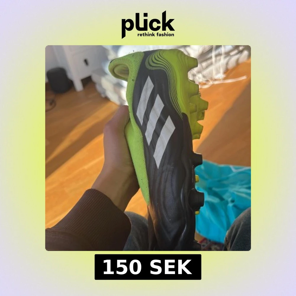 Säljer ett par Adidas fotbollsskor i svart och grön färg. Skorna har en strömlinjeformad design med vita ränder på sidan och en mönstrad sula för bra grepp på planen. Perfekta för fotbollsträning och matcher.