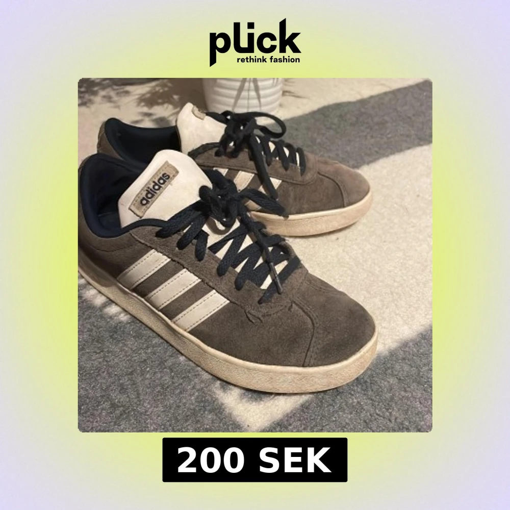 Säljer ett par klassiska Adidas sneakers i grå mocka med vita ränder och svart innersula. Skorna har svarta snören och vit sula. Perfekta för dig som gillar stilrena och tidlösa sneakers med retrovibbar.