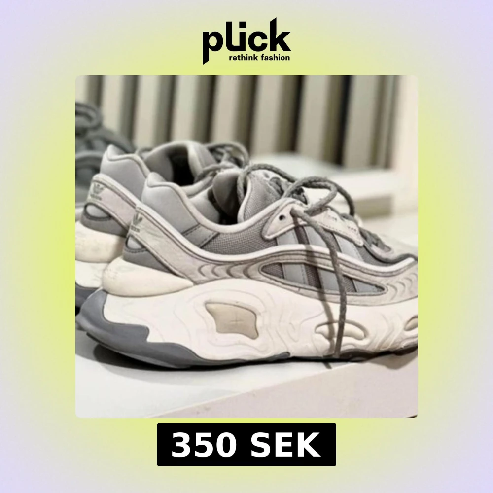 Säljer ett par Adidas sneakers i grått och vitt med chunky sula och klassiska ränder på sidan. Skorna har snörning och en modern, sportig design med detaljer i syntet och mesh. Perfekta för dig som gillar streetwear och bekväma skor.