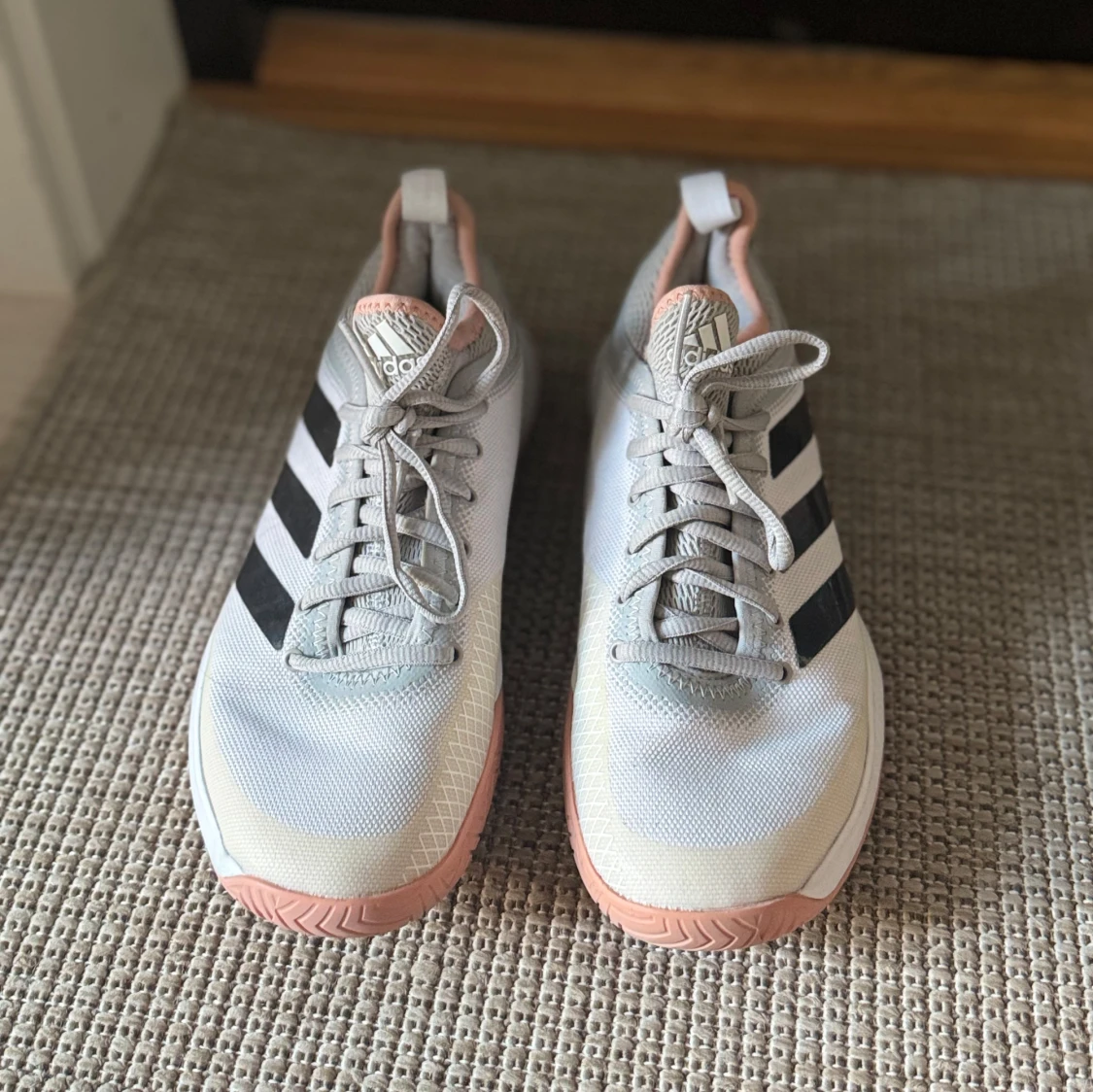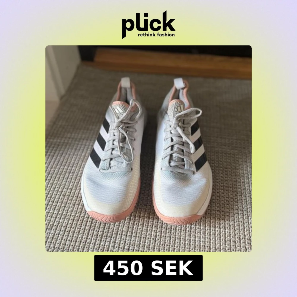 Snygga Adidas Bounce sneakers i ljusgrå mesh med detaljer i ljusrosa/beige. Skorna har snörning, platt sula och rund tå. Perfekta för träning. Använd någon enstaka gång.