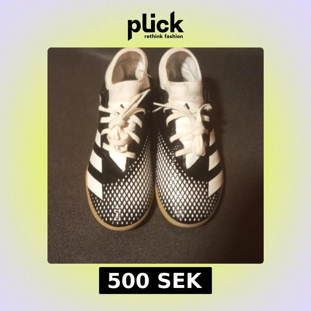 Säljer ett par Adidas fotbollsskor med svart och vit färg, klassiska tre ränder på sidan och mönstrad ovandel. Skorna har snörning och platt gummisula som passar perfekt för inomhusspel. Materialet är syntet och skon har en rund tå.