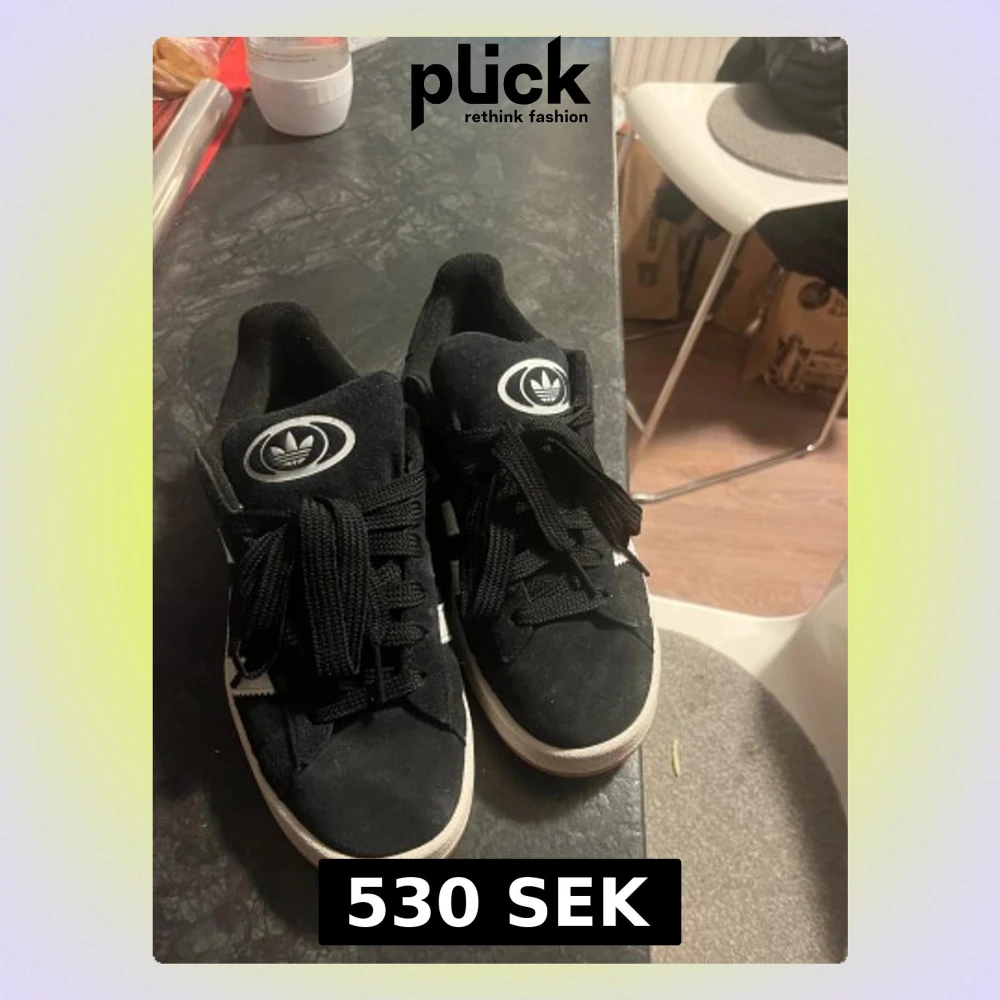 Svarta Adidas Campus sneakers med vita ränder och logga på plösen. Skorna har snörning och en platt, gummisula i orange. Ovandelen är i mocka och insidan är mjuk. Klassisk och stilren modell med rund tå och låg profil. Inte super använda så dem är i bra skick.