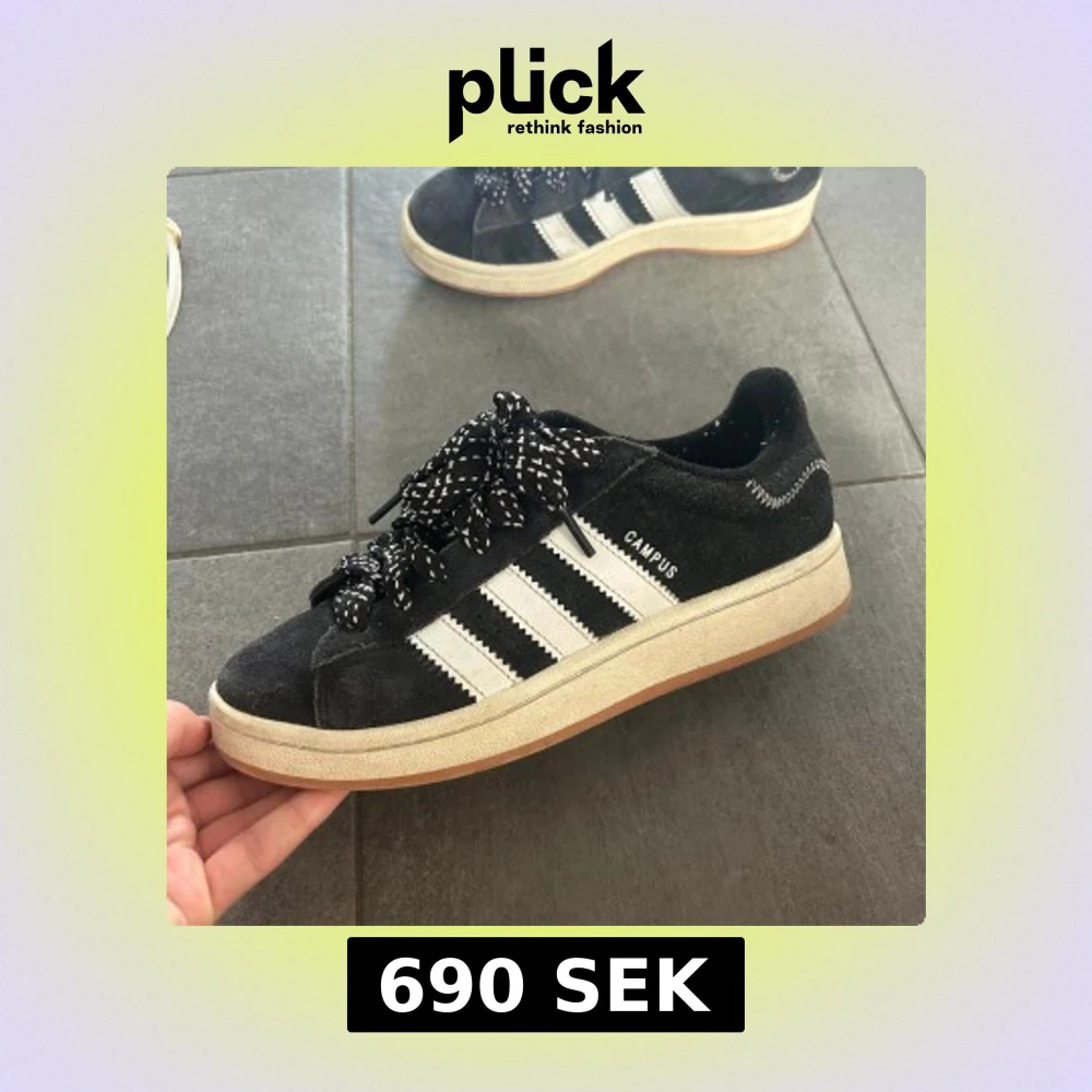 Svarta Adidas Campus , i en ganska unik tråd , medföljer en vit tråd också .Skorna är inte tvättade därför de ser lite smutsiga ut .Skriv innan ni köper .Köpta ifrån Adidas.Haft de sedan april .Pris kan diskuteras