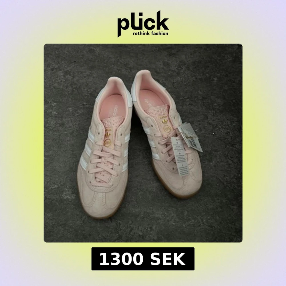 Snygga Adidas Gazelle sneakers i ljusrosa mocka med klassiska vita ränder och gummisula. Guldiga detaljer på tungan och sidan, samt vit hälkappa. Perfekta för dig som vill ha en stilren och trendig look med en touch av retro. Nypris:1449kr