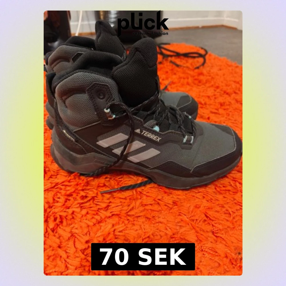 Grymma Adidas Terrex kängor i svart och grått med robust sula och snörning. Perfekta för utomhusaktiviteter, med slitstarkt syntetmaterial och klassiska tre ränder på sidan. Hög modell som ger bra stöd och skydd för foten.
