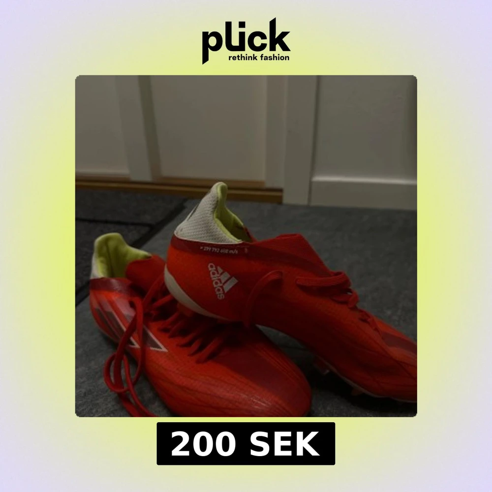 Säljer ett par röda Adidas fotbollsskor med vita och neongula detaljer. Skorna har snörning, låg profil och dobbar för bra grepp på planen. Tillverkade i syntetmaterial med sportig design och klassisk Adidas-logga på sidan.