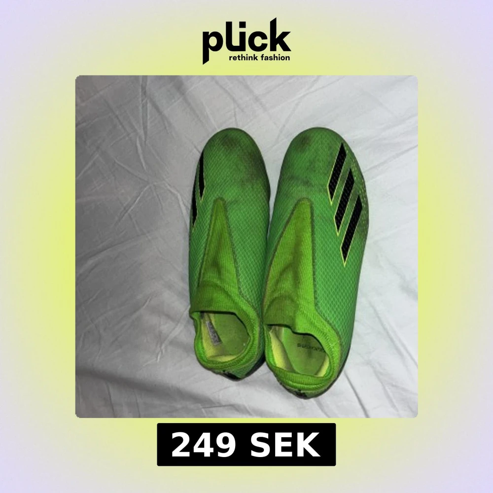 Snygga gröna fotbollsskor från Adidas med svarta detaljer. Skorna har en strömlinjeformad design utan snörning och är perfekta för snabba rörelser på planen. Yttersulan har flera dobbar för bra grepp.