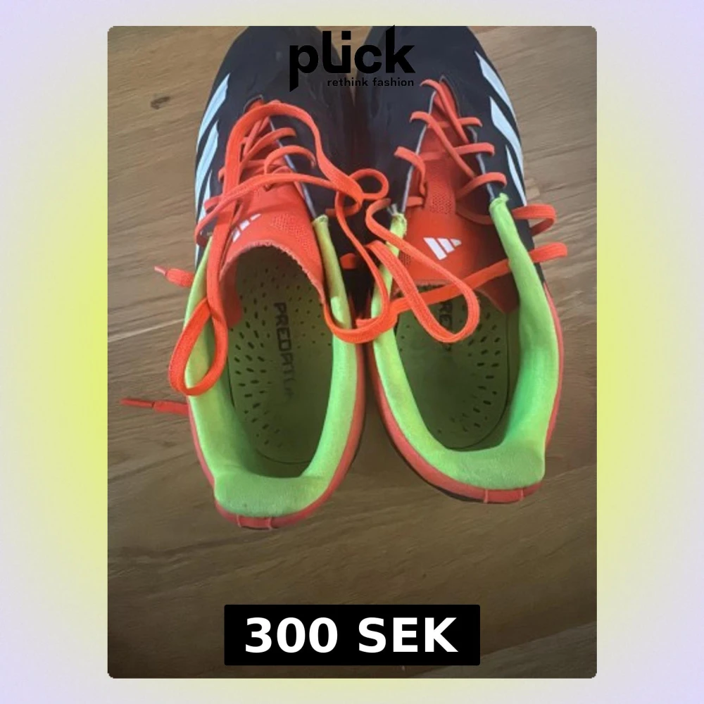Säljer ett par Adidas Predator fotbollsskor med svart ovandel, vita ränder och orange detaljer. Skorna har snörning, rund tå och platt sula med dobbar för gräsplan. Insidan är limegrön och märkt med Predator. Perfekt för dig som vill ha grym kontroll på planen.