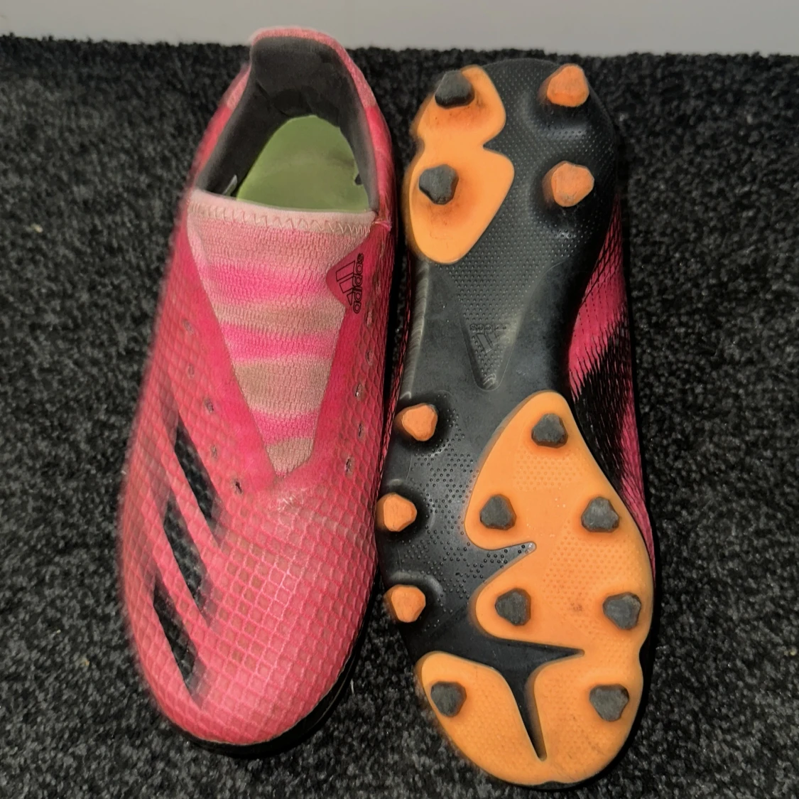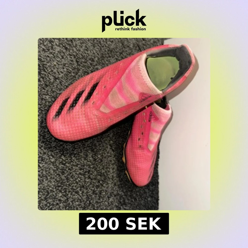 Snygga rosa fotbollsskor från Adidas med svarta detaljer och en mönstrad yta. Skorna har en strumpliknande passform utan snörning och en slitstark sula med dobbar för bra grepp på planen.