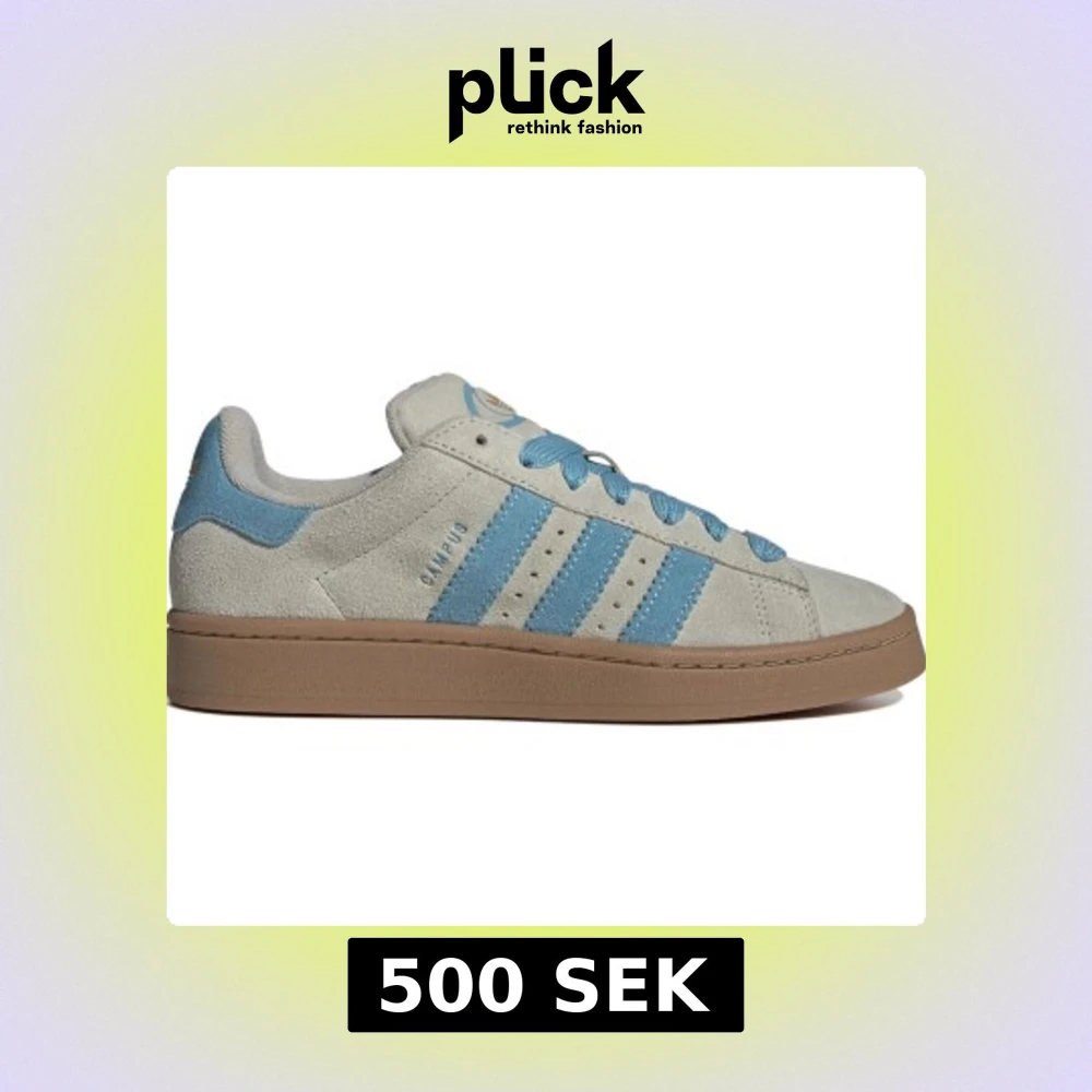 Säljer ett par Adidas Campus sneakers i grå mocka med klassiska blå ränder och matchande blå snörning. Skorna har en brun gummisula och låg profil, perfekt för en stilren vardagslook. Skriv för fler bilder💗