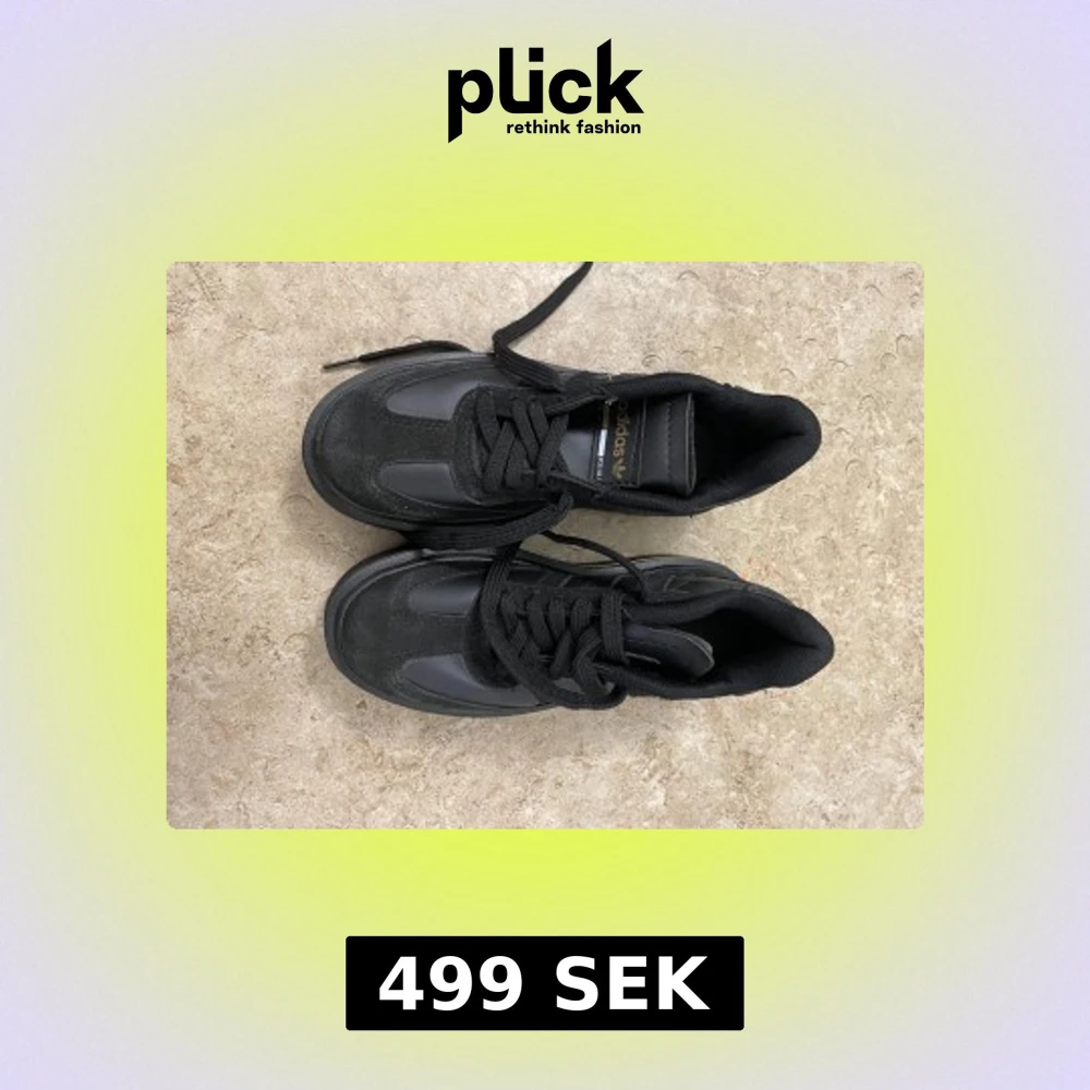 Säljer ett par svarta Adidas sneakers med platåsula och klassiska tre ränder på sidan. Skorna har snörning, detaljer i mocka och skinn samt en diskret guldfärgad linje på sulan. Perfekta för dig som vill ha en stilren och chunky look.