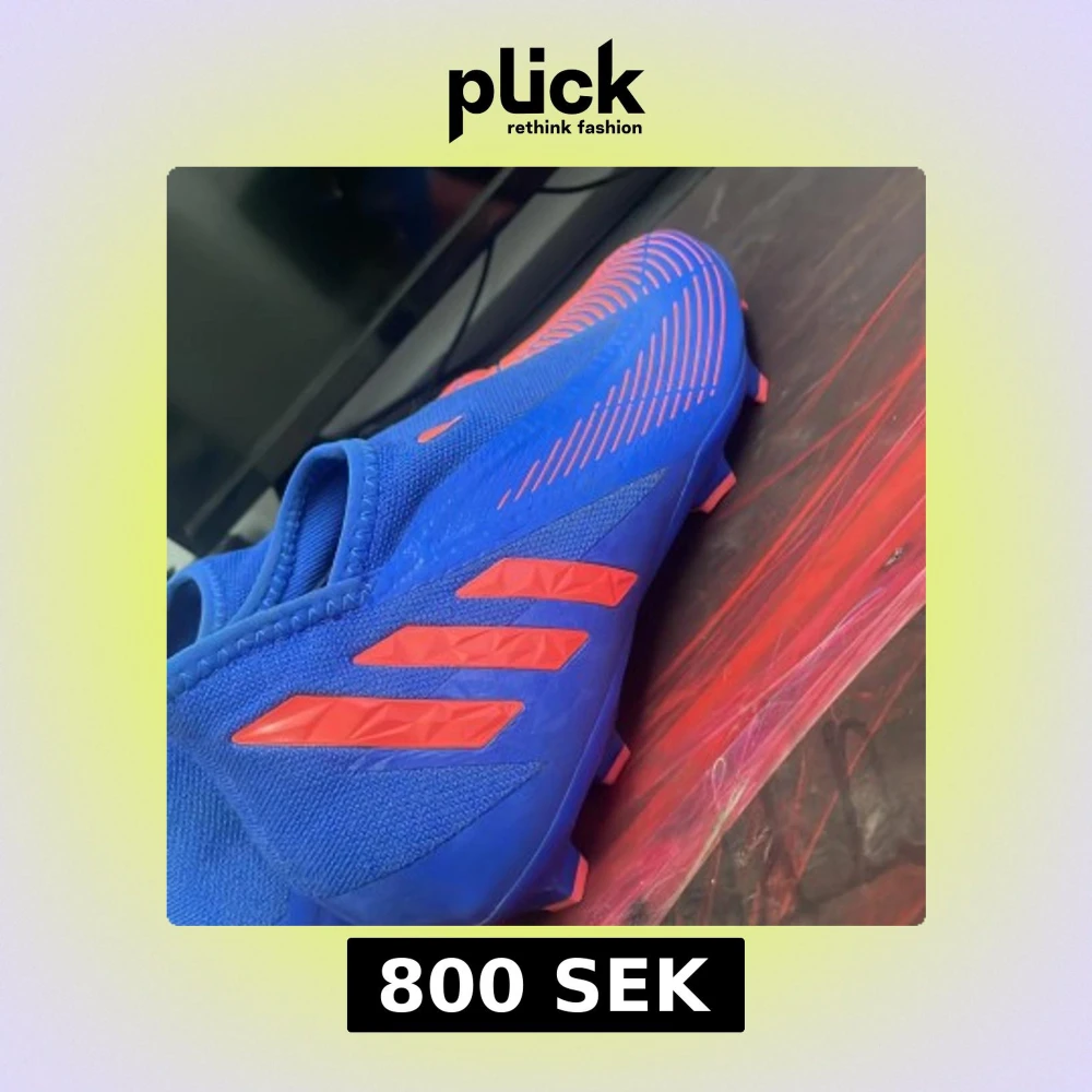Säljer ett par Adidas Predator fotbollsskor i en cool blå färg med röda detaljer och mönster. Skorna har en strömlinjeformad design utan snörning, med syntetiskt material och klassiska tre ränder på sidan. Perfekt grepp för planen och riktigt snygg look.