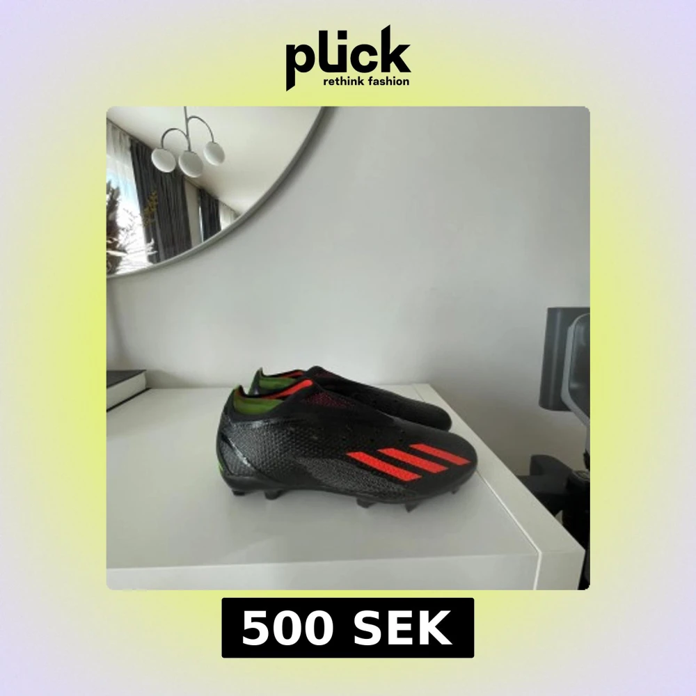 Snygga svarta fotbollsskor från Adidas med röda detaljer och tre klassiska ränder på sidan. Skorna har en strömlinjeformad design, inslag av neon-grönt vid häl och insida, samt ovandel i syntetmaterial. Perfekta för dig som vill sticka ut på planen.