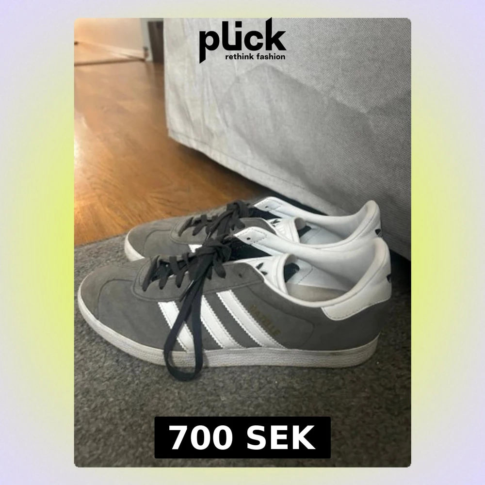 Säljer ett par klassiska Adidas Gazelle sneakers i grå mocka med vita detaljer och svarta skosnören. Skorna har den ikoniska trefoil-loggan på hälen och tungan samt vita ränder på sidorna. Perfekta för dig som gillar retrostil och streetwear. Skorna är använda fåtal gånger! Och vita skosnören ingår!
