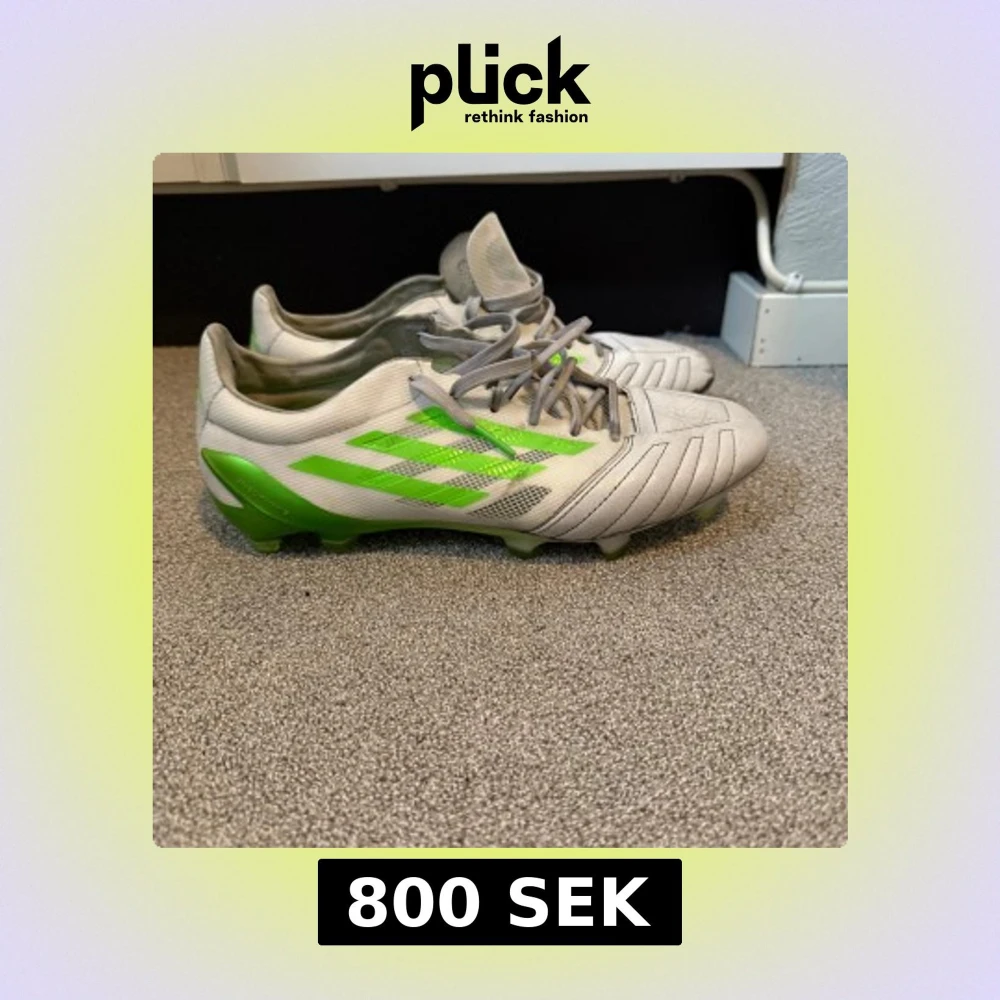 Snygga fotbollsskor från Adidas i vitt med gröna detaljer och klassiska ränder på sidorna. Skorna har snörning och är tillverkade i syntetmaterial med mönstrad ovandel och dobbar för bra grepp på planen. Perfekta för dig som vill sticka ut på matchen!